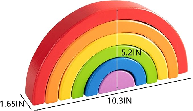 Wooden Rainbow Stacking Toy: 6 pieces nesting together measure 10.3" wide x 5.2" high x 1.65" thick. Applicable age: 18 Months +