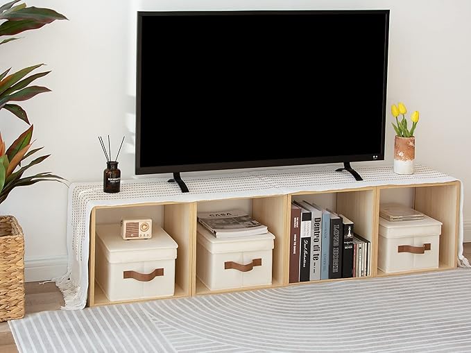 StorageWorks Storage Bins with Lids, Decorative Storage Boxes with Lid and PU Handles, Foldable Storage Baskets for Closet, Shelves, Stackable, Ivory, Medium, 3-Pack