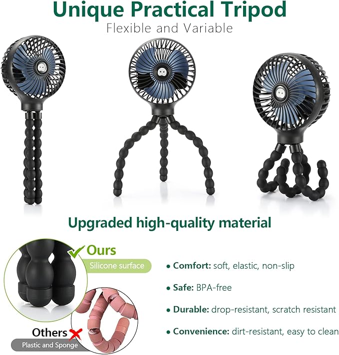 - 【Upgraded Flexible Unbreakable Tripod】snawowo baby stroller fan has an upgraded tripod which is made of high quality bendable metal and food grade silicone surface instead of the old plastic and sponge surface. so you don't have to worry about the baby eating it by mistake. The tripod is waterproof, not easy to get dirty and broken, easy to clean, and more anti-wear.