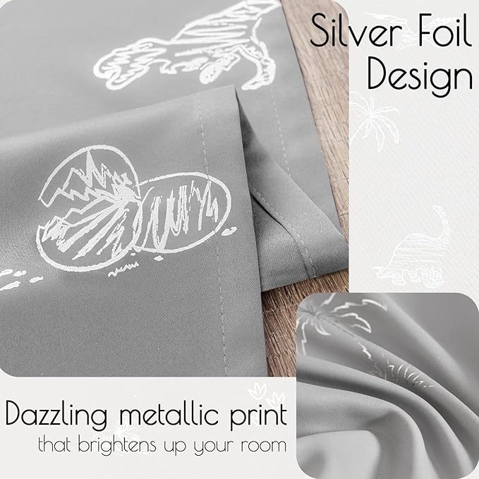 - Dinosaur Foil Printed Curtains: With these two panels 52" wide x 63" long of cute Dino Foil Printed Curtains that will add charm and whimsy to your little ones' room, guest room, or any space that needs a touch of magic
