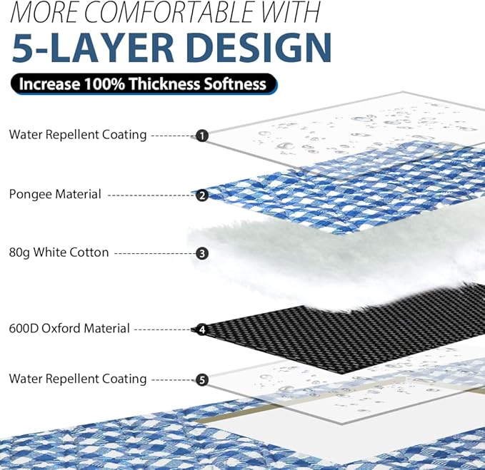 - Soft and Durable with 5-Layers: Made of 3 layers, our picnic mat has thickened and sturdy fabric on the top, soft cotton for middle and solid fabric backing. Perfectly suitable for siting or lying on grass, beach, floor or any kindly of surface, giving you soft and comfortable feelings