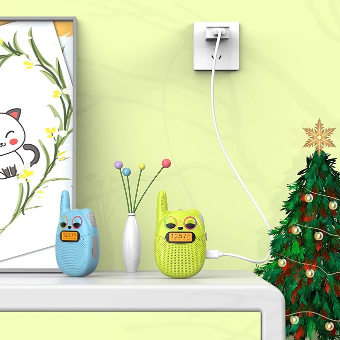 - 𝗖𝗹𝗲𝗮𝗿 𝗦𝗼𝘂𝗻𝗱 & 𝗙𝗠 𝗥𝗮𝗱𝗶𝗼: The rechargeable kid walkie talkies 2 pack feature with FM radio, your kids would search channels and listen to music or real-time news on the FM. The sound is so clear that you could hear each other within 2 miles range.