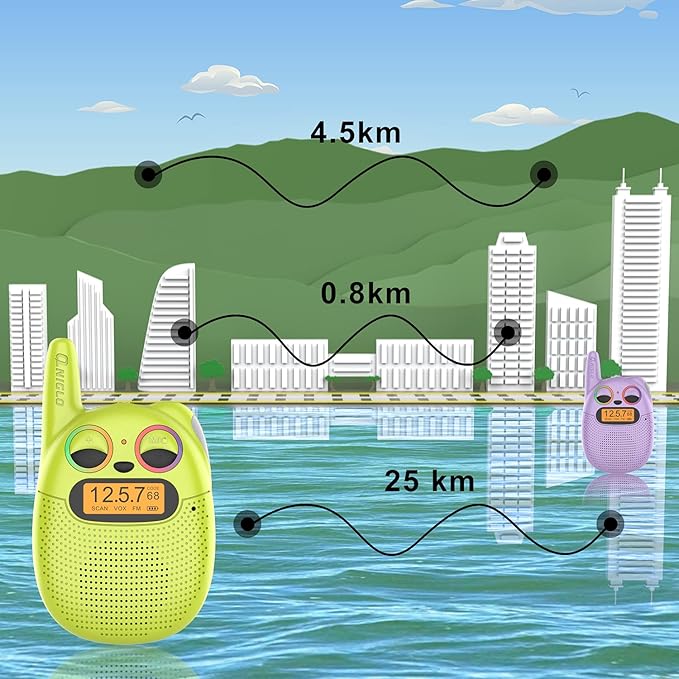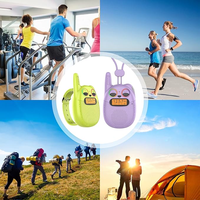 - 𝗖𝗹𝗲𝗮𝗿 𝗦𝗼𝘂𝗻𝗱 & 𝗙𝗠 𝗥𝗮𝗱𝗶𝗼: The rechargeable kid walkie talkies 2 pack feature with FM radio, your kids would search channels and listen to music or real-time news on the FM. The sound is so clear that you could hear each other within 2 miles range.