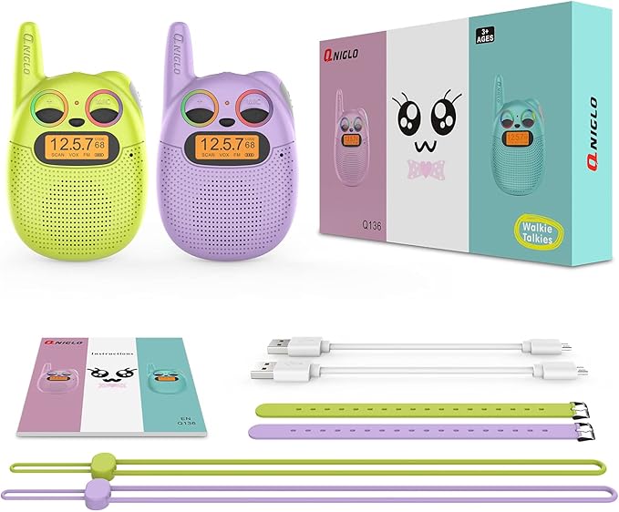 - 𝗣𝗲𝗿𝗳𝗲𝗰𝘁 𝗚𝗶𝗳𝘁𝘀 𝗳𝗼𝗿 𝗞𝗶𝗱𝘀: Qniglo walkie talkies for kids rechargeable come in adorable colors and are well packaged in a stylish gift box, look attractive to kids. Excellent color box design makes it a wonderful birthday gift, Easter gifts, Valentine's gifts, Children's Day gifts, and Christmas gifts for 3 4 5 6 7 8 9 10 11 12-year-old girls, boys, or family group outdoor games like hiking, camping, traveling.