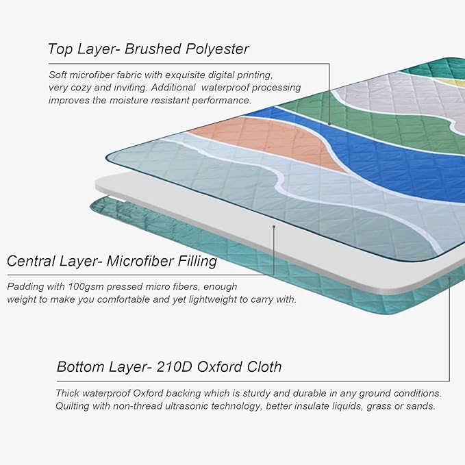 - Premium Three Layers Design: Crafted with soft brushed fabric on top, thick microfiber padding, and 210D Oxford backing. Both sides feature a waterproof coating, while ultrasonic quilting improves moisture resistance and insulation from grass or sand