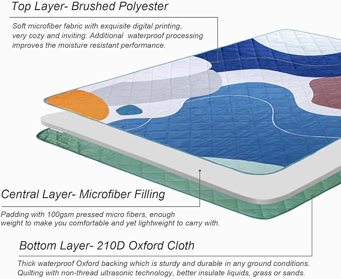 - Premium Three Layers Design: Crafted with soft brushed fabric on top, thick microfiber padding, and 210D Oxford backing. Both sides feature a waterproof coating, while ultrasonic quilting improves moisture resistance and insulation from grass or sand