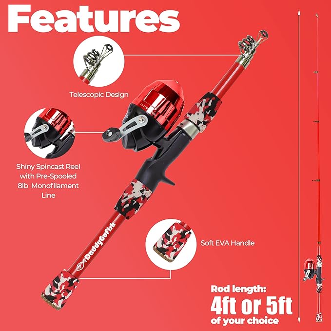 - EASY TO SET UP AND USE - The telescopic rod and pre-spooled reel make it incredibly convenient for kids to start fishing right away. There's no need to worry about complicated setup procedures, which can often be frustrating for inexperienced anglers. With this fishing set, kids can start enjoying the outdoors and catching fish in no time!