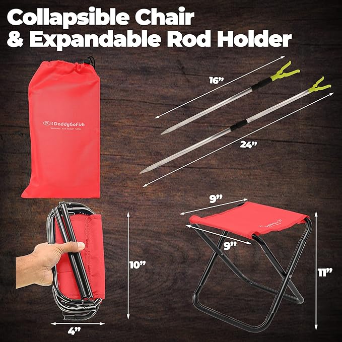 - COLLAPSIBLE CHAIR AND ROD HOLDER - Kids have a place to rest wherever they go. The rod holder keeps the fishing pole off the ground and minimizes the chance of accidental damage.