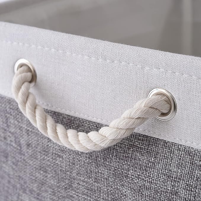 - Made of linen and thicken environmental EVA for reliable performance. Dimensions (each): 11.8 (L) x 7.9 (W) x 5.2 (H) inches.This collapsible basket set provides attractive, lightweight storage. Saves space when not in use and collapses flat for easy storage. It helps keep a room looking neat and tidy. The neutral color combination fits most décor while the two side carry handles make it easy to carry