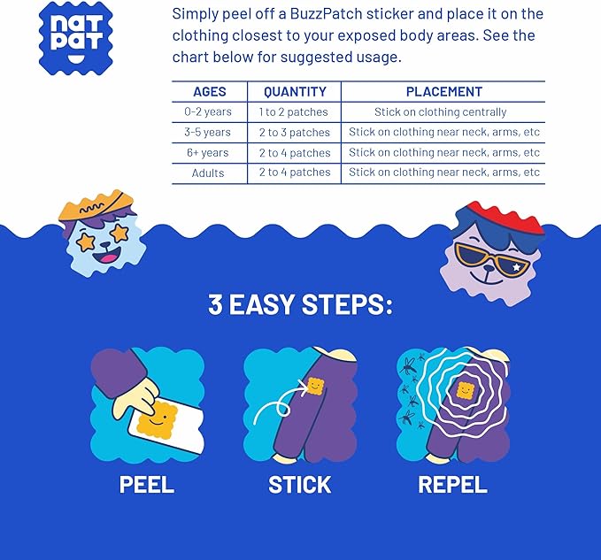 - MEDICAL GRADE ADHESIVE PATCHES – Made from non-woven, medical-grade fabric, NATPAT BuzzPatch Mosquito Patches are durable, water-resistant, and designed to stay in place during all kinds of activities. With a pleasant scent and gentle ingredients, these family-friendly patches offer dependable protection for both kids and adults.