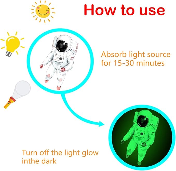 - EASY TO USE - The stickers need to absorb light before they emit light. You only need to put them in a flashlight or sunlight for 15 to 30 minutes, then turn off the light you will see a magic starry sky view on your eyes. The longer the light absorption time, the longer the lighting time.