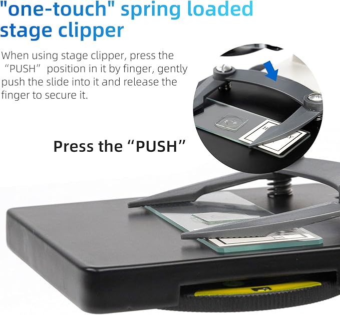 - [Multiple Humanization Designs] 45Β°inclined ocular tube with 360Β° rotatable head lets you observe comfortably and share view with friends. Coaxial coarse & fine focusing knobs. Equipped with "one-touch" spring-loaded stage clips, which is easy to place a slide. Spare bulb is included for replacement