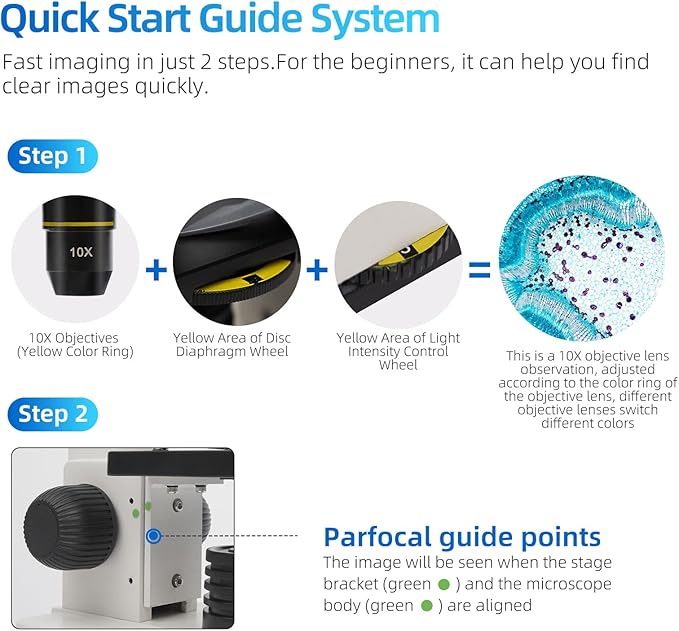 - [Quick Start Guide System] The system helps beginners to quickly get sharp images by easily matching colors of objective color ring and other parts. Besides, microscope is marked with focus guide to assist in quickly focusing