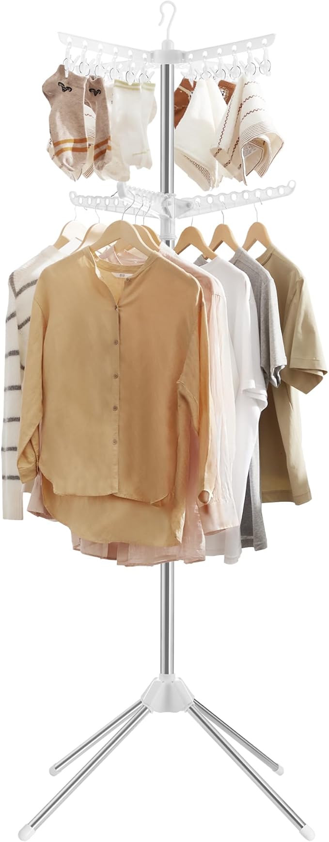 - [Large Capacity] Designed with 27 holes for holding hangers on the second tier and 24 clips on the first tier, this laundry rack can hold lots of clothes and accessories; total max. static load capacity: 35 lb