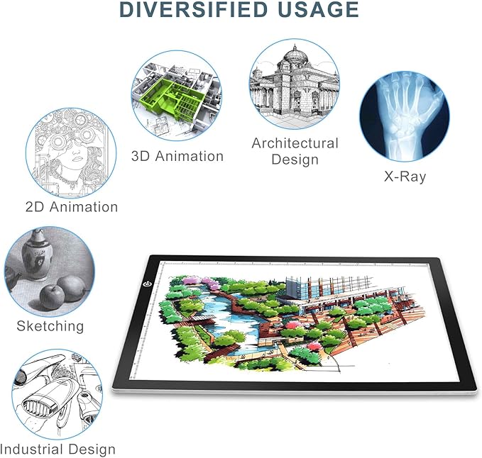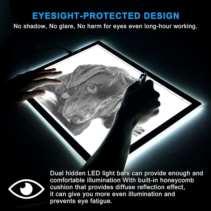 NO SHADOW, NO GLARE, PROTECT EYES. The light pad providing ideal working lighting environment for penmanship and design. Providing the most comfortable lighting environment for animators, designers, art enthusiasts. children and reader.