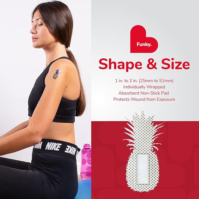 - FUNKY PINEAPPLE BANDAGES: This 24 piece pack of adorable and delicious looking tropical pineapple bandages is great for putting a smile on kids' faces while protecting wounds such as cuts, scrapes, and burns; sticky bandages are perfect for kids and adults alike, and also for school nurses and pediatric doctors