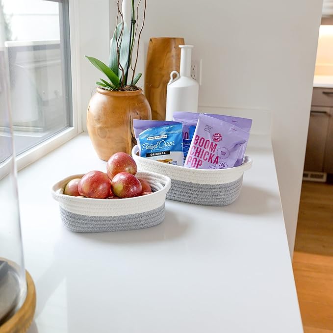 - 5 BASKETS FOR 5X THE ORGANIZING POWER: Life is messy...but your house doesn’t have to be! With 5 beautiful rope baskets for organizing, you’ll defeat messy rooms like a true supermom! Use the largest baskets for Montessori displays or countertop fruits holder, create the cutest dog toy storage or bathroom hand towel holder with the medium ones and stash jewelry or keys in the smallest. Biggest (11.8"x8.7"x4.3"), (11"x7.9"x3.9"), (10.2"x7.1"x3.5"), (9.1"x6.3"x3.1"), Smallest (7.9x5.5"x2.8")