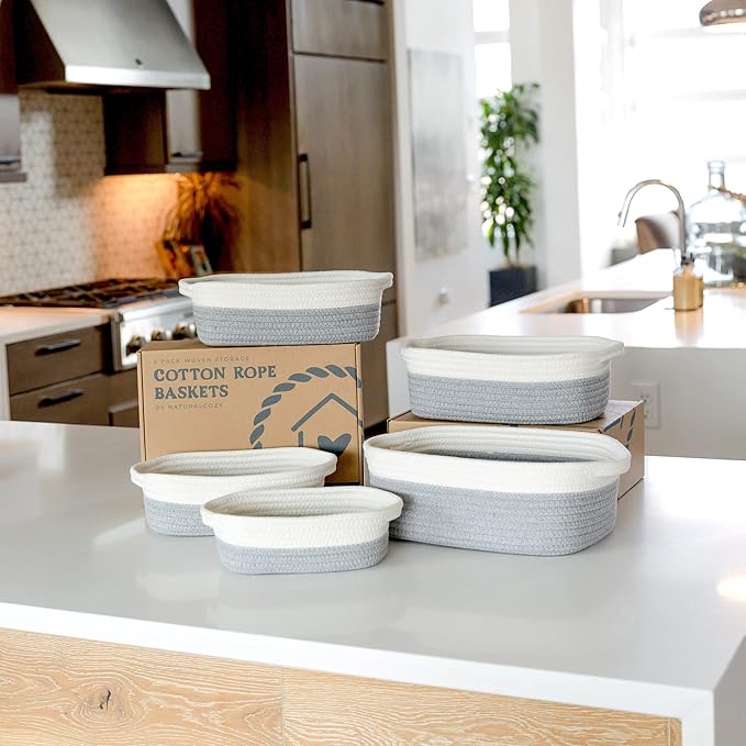 NaturalCozy 5-Piece Rectangle Storage Basket Set- Natural Cotton Rope Woven Baskets for Organizing! Small Basket for Montessori, Baby Nursery, Dog Toy Baskets, Cat Toy Box, Bathroom Organization Bin