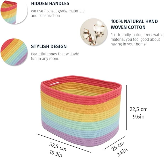 - All-Purpose Rainbow Storage Baskets – This 15” x 10” x 9” rainbow rope baskets for organizing is ideal for keeping your everyday home life more organized and provide plenty of compact storage space for arts and crafts, rainbow classroom decor, kid’s toys, or nursery room accessories