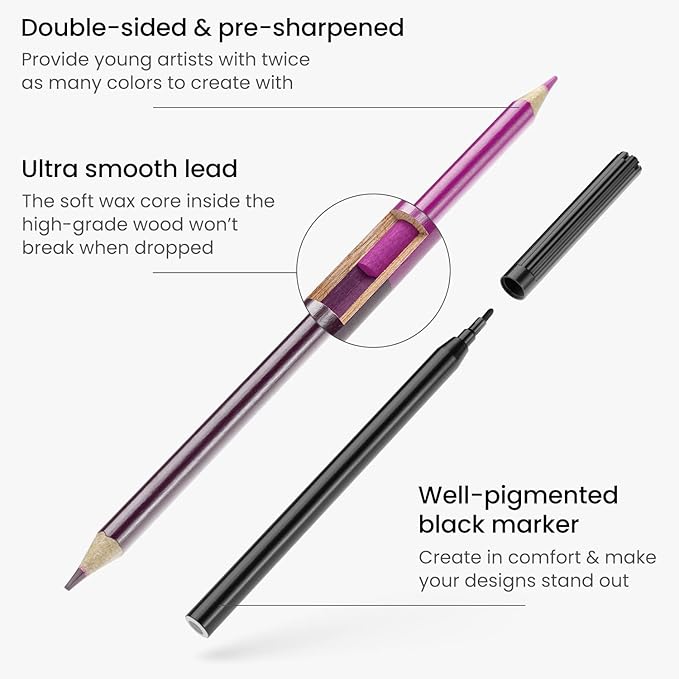 Set Includes 12 Double-Ended Colored Pencils in 24 Colors: Our coloring book set also included colored pencils for kids, one pencil sharpener, one eraser, and one black marker.