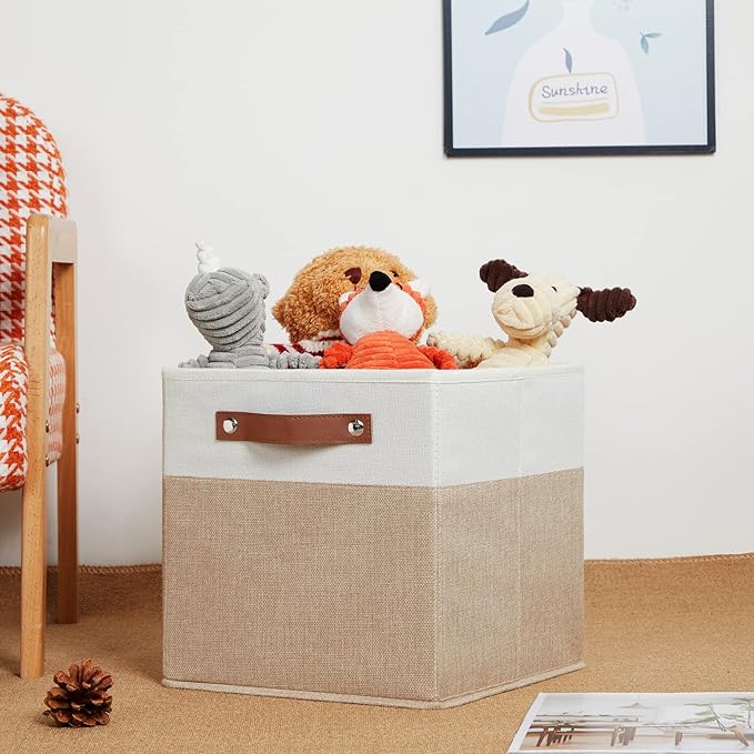 - 【Premium Material】The fabric used in the 11 inch fabric storage cubes bins baskets for shelves is fashionable and breathable, sturdy, breathable fabric materials with no peculiar smell, and the cardboard inside is strong and easy to fold. These organizing closet storage bins are sturdy enough to hold your stuff well. The leather handle is sturdy and easy to carry