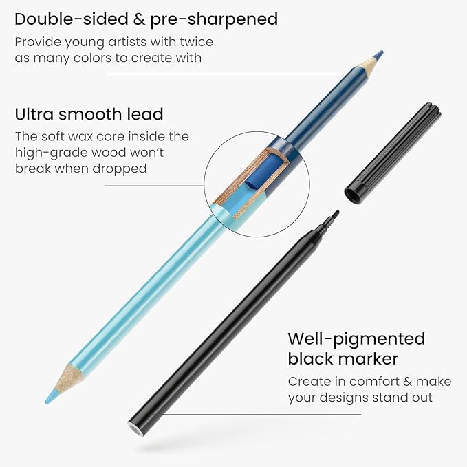 - Set Includes 12 Double-Ended Colored Pencils: Our doodle book also includes colored pencils for kids, one pencil sharpener, one eraser, and one black marker.