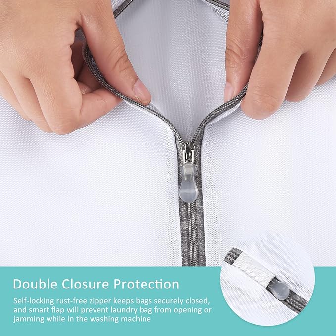 Upgraded anti-rust zipper with auto lock feature and side small zipper cover will keep the bag closed when washing and drying. You'll have a new quiet and a snag-free laundry experience. Remember to tuck the zipper under the cover when doing laundry