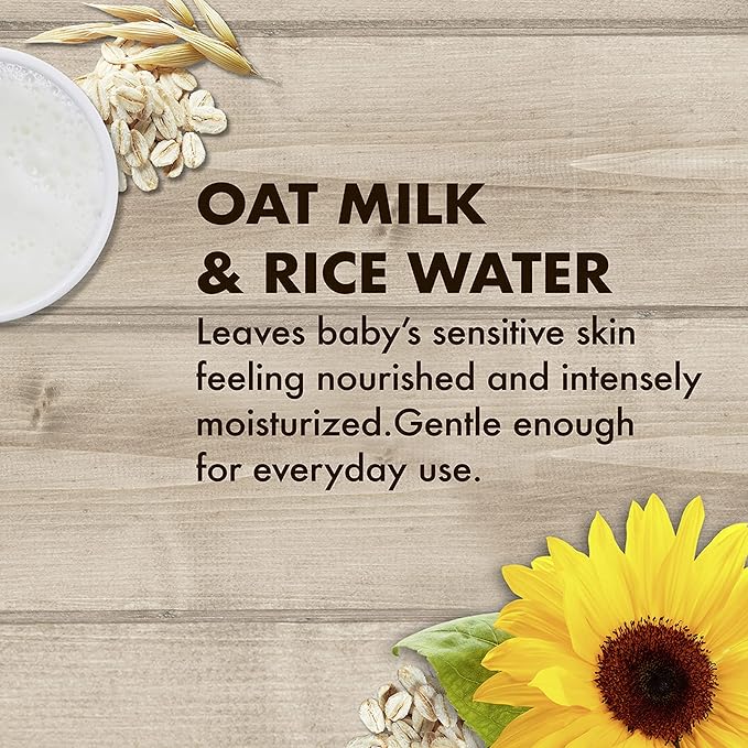 Made with Oat Milk, Rice Water, Sunflower Seed Oil and Fair Trade Shea Butter, this sensitive skin baby wash and baby lotion for dry skin leaves baby skin feeling nourished and intensely moisturized