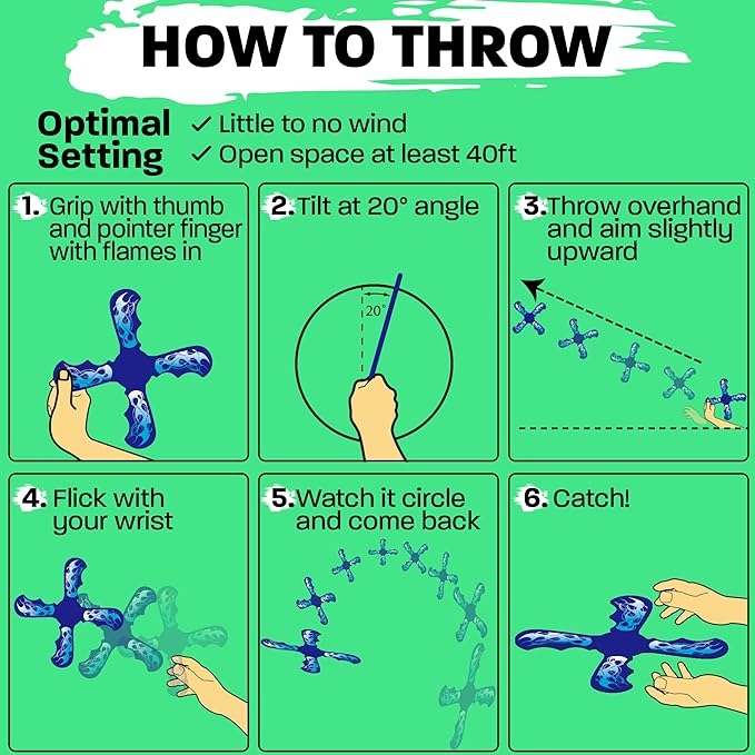 - ๐๐ฎ๐๐ ๐ง๐ผ ๐๐ฒ๐ฎ๐ฟ๐ป: Embrace the simple joy of throwing a boomerang and having it come back to you with ease. With our beginner-friendly easy to throw design crafted from durable EVA foam. It's stable flight and comfortable grip make throwing and catching a breeze, ensuring a quick and enjoyable learning experience for kids age 6 and up.