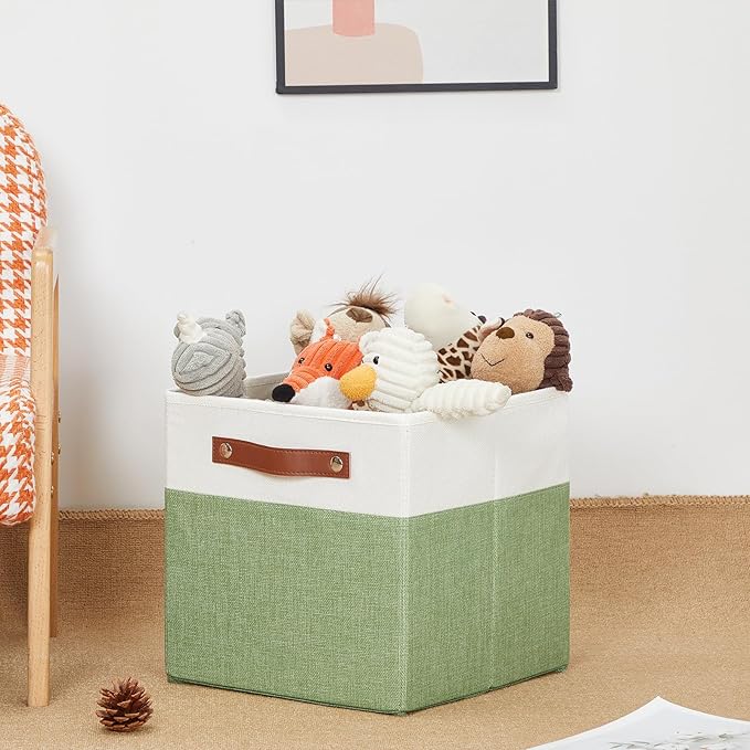 HNZIGE Fabric 11x11 Cube Storage Bins, Set of 4, Foldable Storage Cube Bin Baskets for Shelves with Handles, Bins for Cube Organizer Home Toy Nursery Closet(Green White)