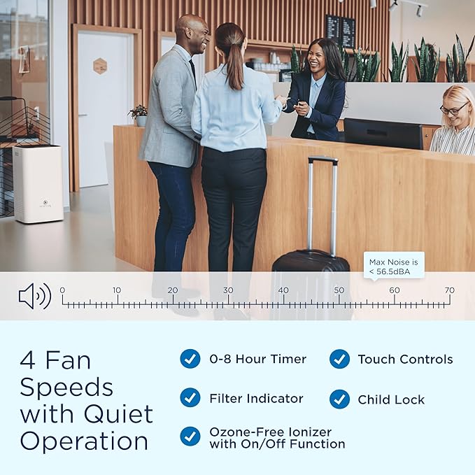 - UV LIGHT: An added layer of protection so particles are trapped and fully removed from the air. Includes a touch operation panel with 0-8 hour timer, 4 fan speeds, sleep mode, auto mode, filter replacement indicator, and child lock, great for both kids and pets.