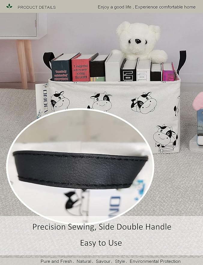Rectangular Folding Laundry Basket,Canvas Basket,Nersury Hamper,Suitable for Children,Office,Bedroom,Clothes,Toys Storage (REC Cow), 14.9’’L ×10.2’’W×9.05’’H inches