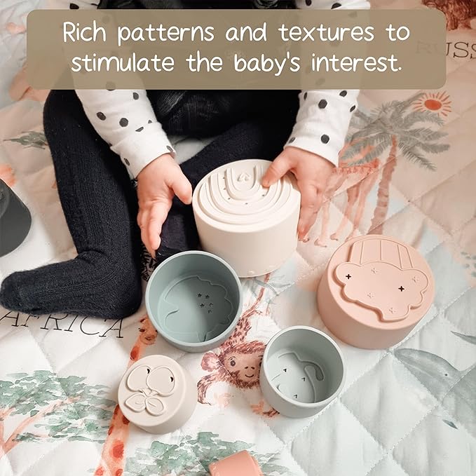 - ✨Innovative Design - 7 stackable cups have different top patterns with exquisite strokes, which enrich the baby’s touch sense. Seven different colors attract their attention and promote visual development. Stacking cups also help kids learn numbers and build fine motor skills.