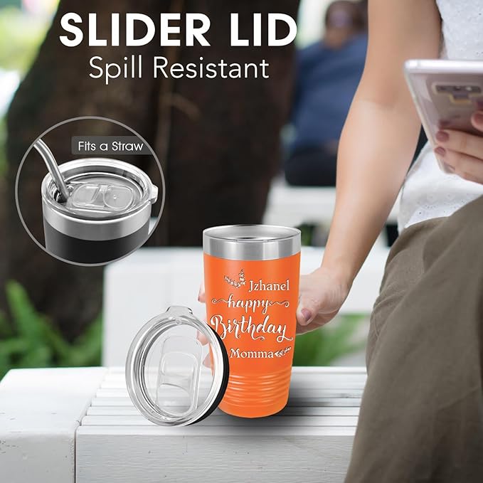 Personalized Gifts, Travel Coffee Mug, Engraved Tumbler with Names and Text, Personalized Cups Double Walled Insulated Coffee Cup for Travel, Work, Gym, Gift for Her, (Orange, 20oz)