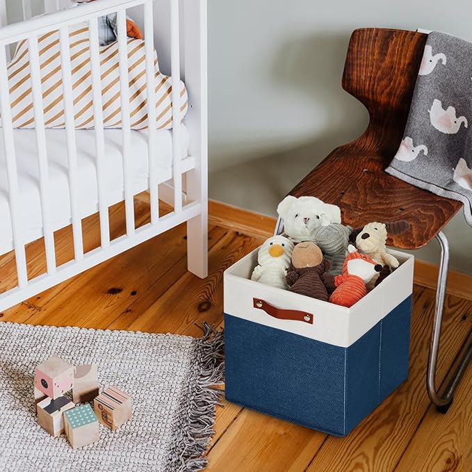 HNZIGE Fabric Storage Cubes Bins for Shelves,13x13 Storage Cubes, Set Of 4 Foldable Cubby Storage Bins for Organizing, Cloth Blue Storage Baskets for Cube Organizer Toy Nursery Shelves(Blue&White)
