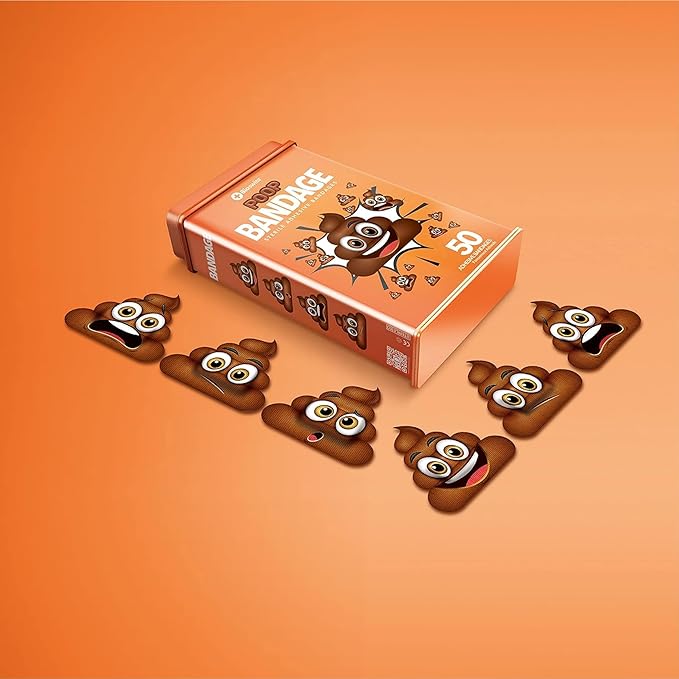 - POOP BANDAGES: This 50 piece tin of funny poo bandages is great for putting a smile on kids' faces while protecting wounds such as cuts, scrapes, and burns, and come in 4 assorted styles; sticky bandages are perfect for kids and adults alike, and also for school nurses and pediatric doctors