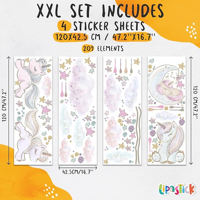 - π¦ Package Content: Large decals for baby room come in a pack of 4 sheets. Includes: unicorns, stars, clouds, moon. The sheet size is 47.2" x 16.7". This set of stickers is size XXL and its finished size is 156.2" x 48β. Perfect for covering full wall.