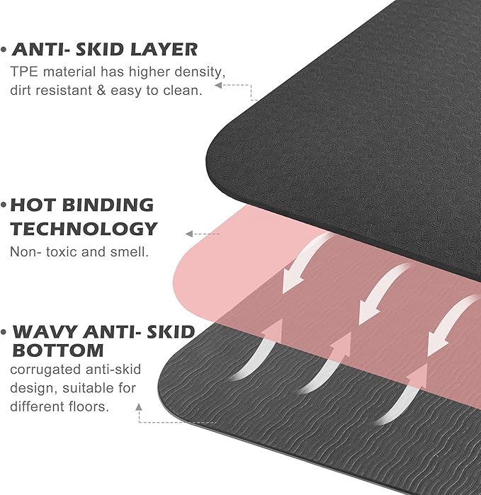 - DOUBLE NON-SLIP DESIGN - This workout mat has double-sided non-slip surfaces. Wavy undersides make excellent traction on the floor. It unrolls pretty flat and stays put. Special textured surface prevents your hands and feet from sliding when you sweat on it.