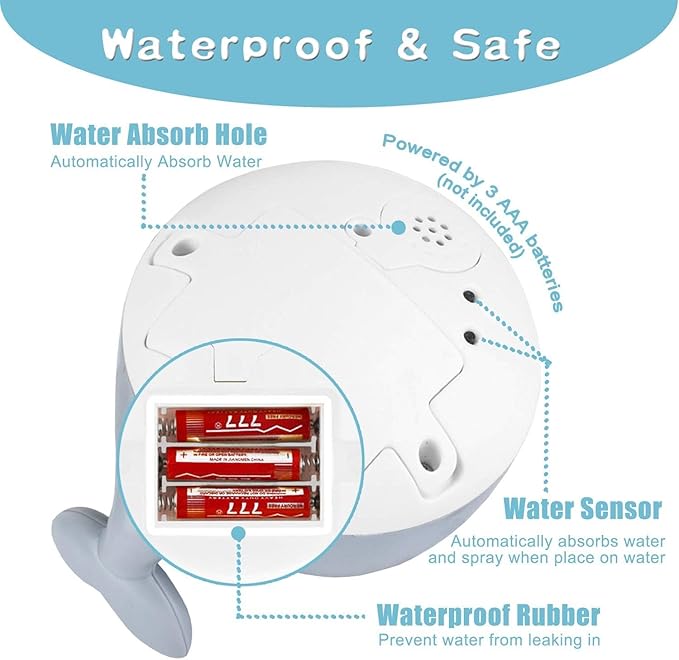 - Easy to Use: The infant tub toys powered by 3 AAA batteries(not included). Water toy has a automatically senses, just install the batteries, and place it on the water, it will automatically induction absorbs water from the bottom and sprays appropriate height water column. When leaves water, all effects will stops immediately. No manual operation is required