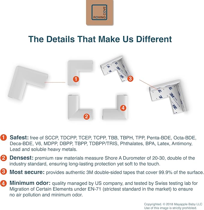 - CLEAN SAFETY: Roving Cove uses safe and pure raw material and was the first brand to make foam safety bumpers without the use of toxic flame-retardant chemicals (SCCPs). Our corner protector contains no BPA, no phthalates, no heavy metals, no latex, no SCCPs. Inherently flame-resistant; passed flammability tests under US regulations.