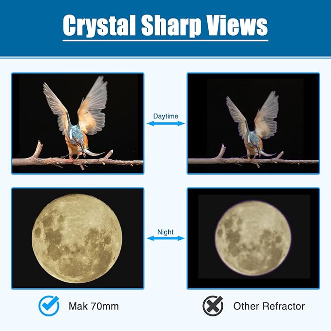 - 【Compact & Powerful】Maksutov-Cassegrain optical design allows 1000mm focal length folded in 210mm length tube. 70mm aperture allows the greater the amount of light entering the telescope and the higher the resolution. It's a camping telescope, easy to pack the compact and lightweight telescope in any backpack and take it for travel.