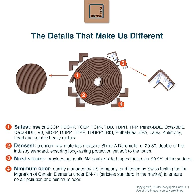 - CLEAN SAFETY: Roving Cove uses safe and pure raw material and was the first brand to make foam safety bumpers without the use of toxic flame-retardant chemicals (SCCPs). Our edge corner guards contain no BPA, no phthalates, no heavy metals, no latex, no SCCPs. Inherently flame-resistant; passed flammability tests under US regulations.