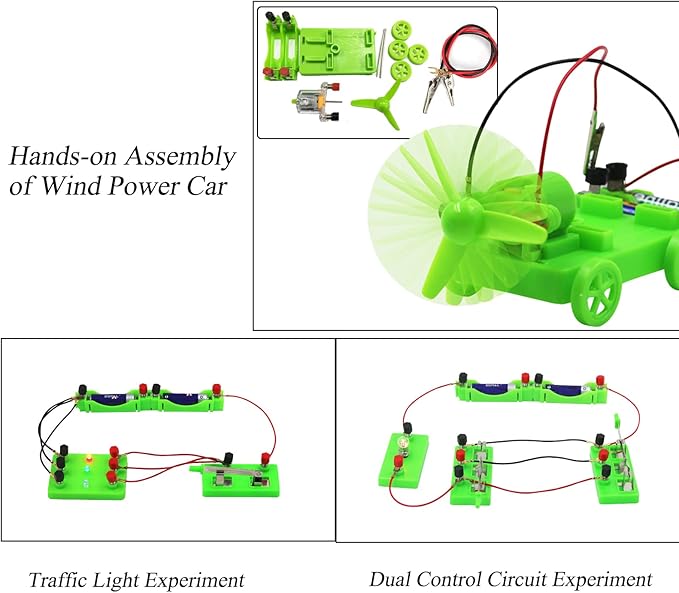 - 【Hands-on Learning】- Traffic Light Experiment: The basic electricity kit for kids adopts newly designed LED board, with three colors of lights: red, green and colorful light, which can better demonstrate the control of lighting by circuit. Hand-cranked Generator Experiment: Using the principle of power conversion, electric energy converts wind power to generate thrust, which is interesting and educational.