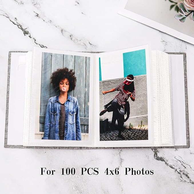 • Size & Capacity: The size of photo albums is 6.7x5.3x2.2 inches. It can hold 4x6 inch photos horizontally with 100 pages and each page holds 1 photo. Photos fit snugly in the pockets and are not easy to slip out