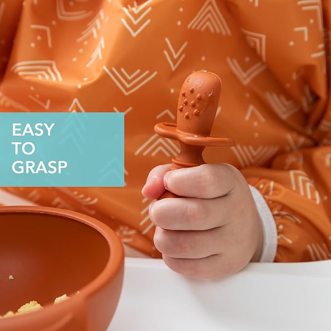 Bumkins Baby Utensils Set, Chewtensils Silicone Spoons for Dipping, Self-Feeding, Baby Led Weaning, Trainer Learning, First Stage Eating, Soft Practice Fork and Spoon, Babies 6 Months, Clay