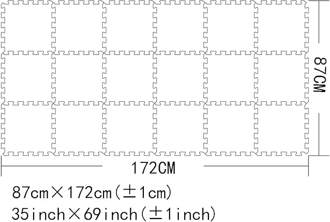 • ☺ Play Mat Size: the size of one piece:30 x 30 x 1CM (11.8 x 11.8 x 0.4 inches); 18 pieces mats cover area: 172cm x 87cm (±1CM) / 69" x 35"(±1inch)