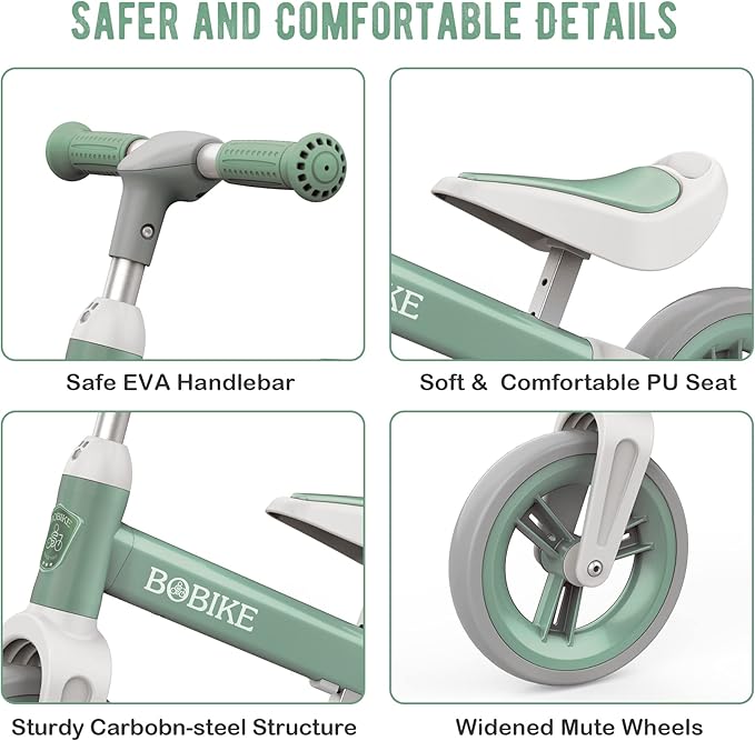 Toddler-friendly design: The two-wheeled balance car is more upgraded, close to the bicycle, Bobike bike body is made of strong and durable carbon steel. Adjustable seat, and enclosed non-slip wheels make you have a peace of mind when guiding your kids with riding the bike.