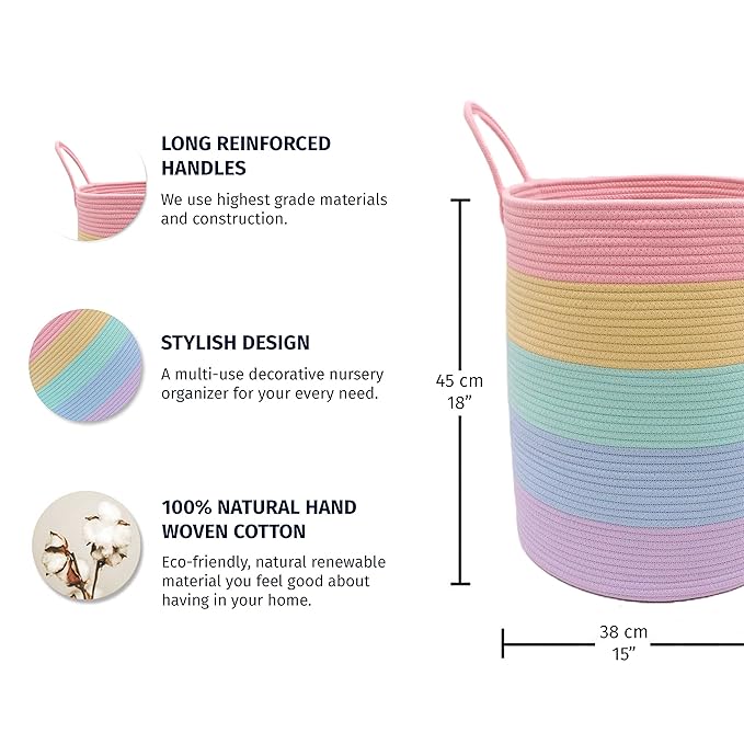 OrganiHaus Cotton Rope Basket for Rainbow Classroom Decor 15x18 | Toy Basket for Pastel Room Decor | Playroom Organization and Storage | Toy Bins & Book Basket | Tall Blanket Basket for Living Room