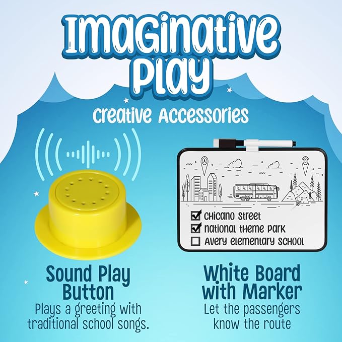 - ENDLESS ADVENTURES WITH SOUND PLAY BUTTON: Equipped with a captivating SOUND BUTTON, your child will be greeted by the friendly bus driver and delightful school songs. This interactive feature in our school bus pop up tent encourages creative storytelling, enhancing your child's cognitive development while having endless fun.