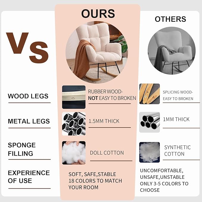 - Soft & Thick Seat - The high back and thick seat cushion are filled with sponge, which is soft, comfortable, elastic and not easy to collapse. The whole recreational rocking chair is soft enough for you to enjoy yourself and relax your body after tired work